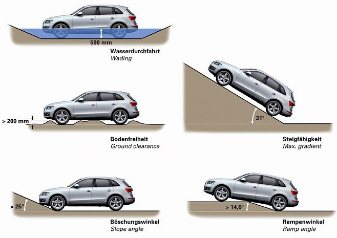 Под стильным кузовом находится система полного привода Quattro с центральным дифференциалом Torsen, но без редуктора. Производитель утверждает, что кроссовер способен преодолеть брод глубиной до полуметра и подняться на горку с уклоном 31 градус. Дорожный просвет составляет 200 мм.