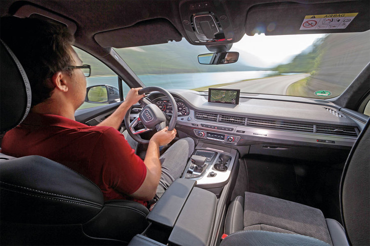 О возможностях системы развлечения и информационной поддержки в Audi Q7 можно рассказать много интересного, однако многие функции доступны только за отдельную плату. Навигационная система MMI Plus (2800 евро) предлагает обновляемые онлайн-карты (с функцией Live-Traffic, информирующей о пробках) и улучшенное распознавание речи для ввода пункта назначения. Онлайн-сервисы доступны через LTE-модуль (310 евро), который может работать как точка доступа Wi-Fi с SIM-картой. Рекомендуется также Audi Phone Box (440 евро), обеспечивающий связь с мобильными телефонами без Bluetooth, например, iPhone. Телефон помещается в специальное отделение на центральной консоли, где происходит беспроводное подключение через индукцию. За дополнительные 250 евро на мониторе Audi Q7 можно установить мобильные приложения Apple Carplay или Android Auto. Последнее позволяет запускать приложения смартфона Samsung Galaxy S5.