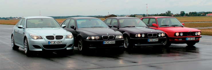 История BMW M5 началась в 1979 году с появлением BMW M535i серии Е12, оснащенного мотором мощностью 218 л.с. Этот автомобиль был предтечей настоящего M5. Первое поколение M5 увидело свет в середине 80-х годов в серии Е28. Автомобиль продолжал использовать рядный 6-цилиндровый двигатель мощностью 286 л.с. и разгонялся до 100 км/ч за 6,5 секунды.