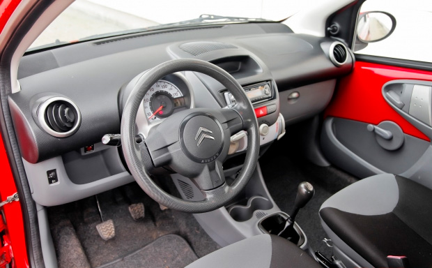 Со временем жесткие пластиковые детали интерьера начинают скрипеть, особенно это заметно на передней панели. Центральная консоль Citroen C1 проста и интуитивно понятна. Рядом с ручкой регулировки вентилятора расположена красная кнопка аварийной сигнализации, изготовленная из некачественного материала, что часто приводит к трещинам.