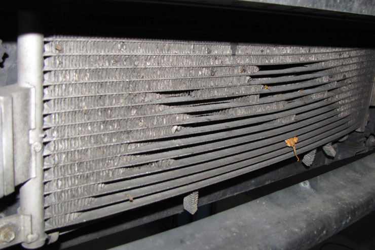 Радиаторы кондиционера на автомобиле постоянно подвергаются удару камней, но, к счастью, они остаются целыми и не протекают.