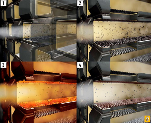 2. Сажа постепенно накапливается в фильтре, что затрудняет прохождение потока выхлопных газов. Система управления автомобиля обнаруживает эту ситуацию и активирует процесс регенерации.