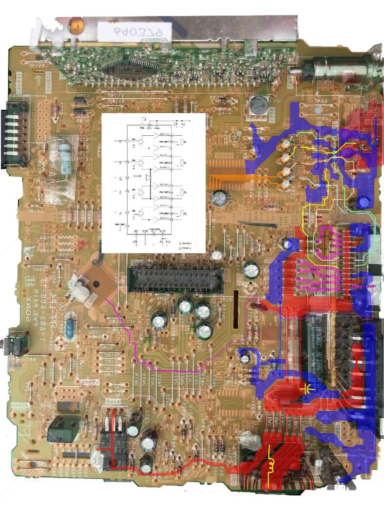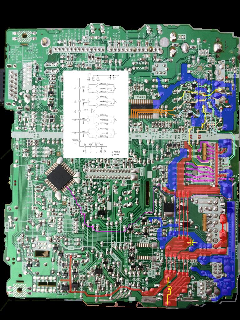 - В-третьих. Либо включая логику, либо с помощью Datasheet (техдокументации) микросхемы предусилителя находим выхода звуковых дорожек с него. В случае на фото это оказались пяточки под номерами FPM 1558 и FPM.