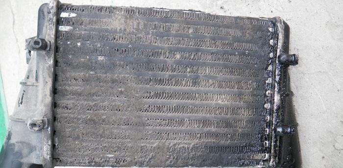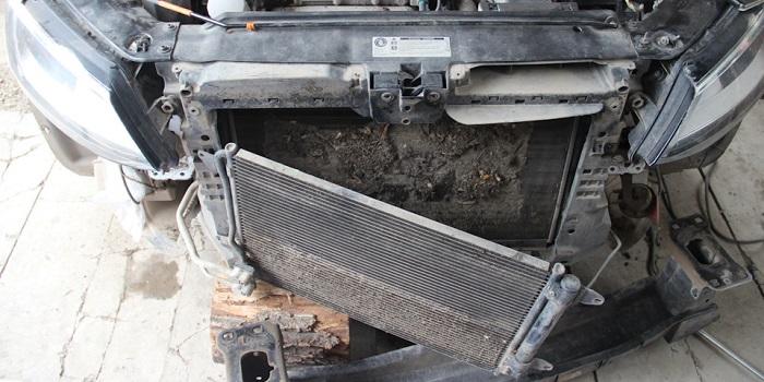 Чистка радиатора снаружи без снятия малоэффективна. Грязь, песок и мелкие камни закупоривают лицевую часть теплообменника, попутно загибая при этом соты. Чтобы протолкнуть эти грязевые пробки, необходимо их сначала размягчить, после чего под прямым углом напором воды под давлением пытаться вытолкнуть наружу. Это значит, что даже без снятия радиатора с автомобиля вам придется как минимум демонтировать бампер, радиаторную решетку и вентиляторы. Без всего этого вы не сможете направить струю воды максимально перпендикулярно сотам, из-за чего промывка радиатора станет впустую потраченным временем. Еще более бессмысленной можно назвать продувку сжатым воздухом или мойку без снятия, если на автомобиле установлен «сэндвич» из радиатора двигателя, конденсатора кондиционера, интеркулера и масляного охладителя АКПП.