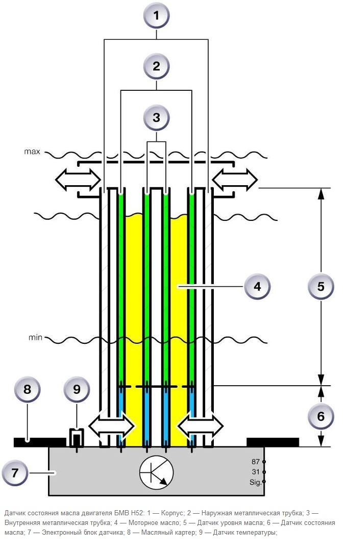 Их принцип действия основан на сопротивлении. При уменьшении уровня масла в моторе BMW или другой модели сопротивление снижается. В результате на лампочку на приборной панели подается напряжение. Если в автомобиле используется блок управления двигателем, то сигнал идет через него.