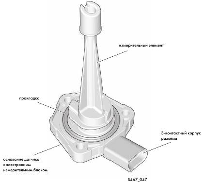 В его корпус встроен PTC-резистор для измерения температуры масла. Устройство включает электронный блок, обрабатывающий ультразвуковые сигналы и данные от PTC-резистора. Преобразованные сигналы в формате ШИМ передаются через ЭБУ двигателя на панель приборов.