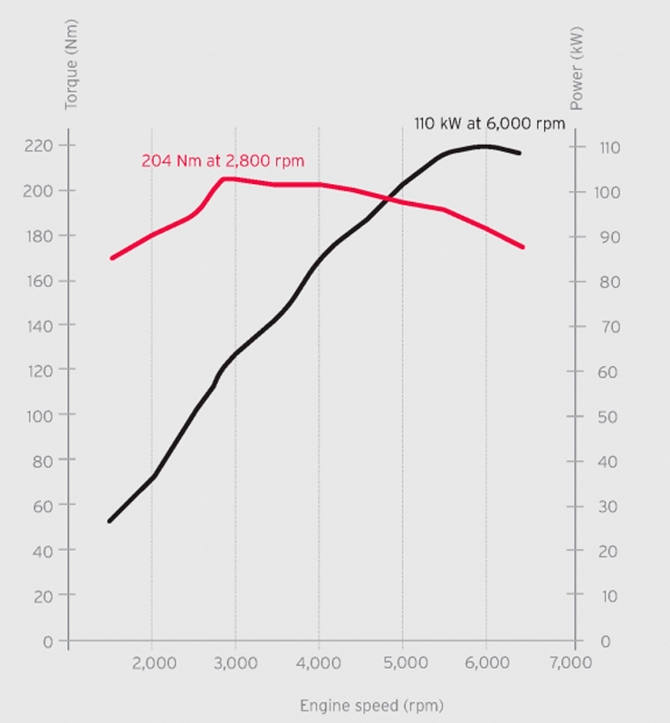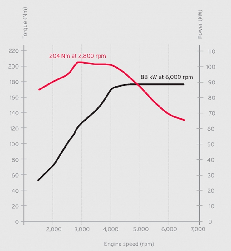 Рабочий объем: 1998 кубических сантиметров. Максимальная мощность: 120 лошадиных сил при 6000 оборотах в минуту. Максимальный крутящий момент 204 Ньютона-метра при 2800 оборотах в минуту.