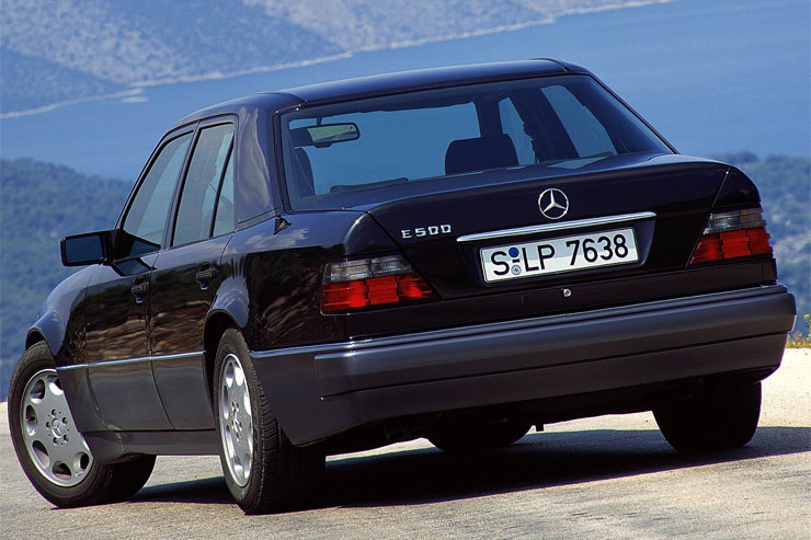 Mercedes 500 E был представлен в 1990 году. В 1991 модель пошла на экспорт в США. В 1992 году была представлена версия 400 Е с тем же V8, но без доработок кузова. В 1993 году седан пережил фейслифтинг и был переименован в Мерседес Е 500. Характерная отличительная черта – более широкие накладки в нижней части кузова. В 1995 году производство 500-го было прекращено.