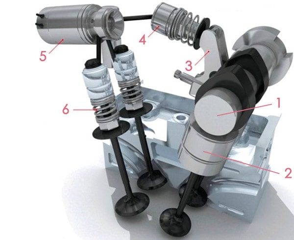 Управление выпускными клапанами осуществляется традиционным способом через распределительный вал (1) и толкатели (2). Однако управление впускными клапанами представляет собой нечто необычное. Распределительный вал оснащен кулачками (3), которые запускают движение поршня (4). Под давлением моторное масло поступает в электромагнитную катушку (5), которая принимает решение о направлении масла к гидравлическим толкателям (6), отвечающим за открывание впускных клапанов. Лишнее масло удаляется через дренажные каналы.