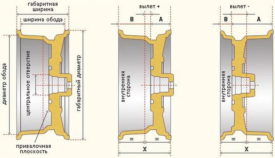 Где Х — это расстояние от наружной привалочной плоскости диска до его внутренней грани со стороны крепления к ступице или тот размер, который определяется путём измерения от боковой грани колеса по бортам до его решётки.