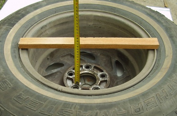 - Сторона диска, которая крепится к ступице, должна оказаться сверху. На нее положите деревянную измерительную рейку, длина которой соответствует диаметру колеса. Важно, чтобы весь инструмент находился на стальных бортах колеса, а не на резине, иначе вынос будет определен неверно, что приведет к ошибкам при покупке нового колеса.