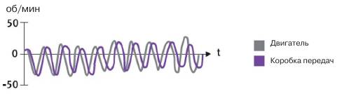 В четырехцилиндровом двигателе воспламенение смеси происходит каждые 180º вращения коленвала. При 3000 оборотов в минуту смесь воспламеняется 6000 раз в минуту. В этом режиме крутильные колебания минимальны из-за короткого времени замедления коленчатого вала. При снижении скорости вращения крутильные колебания увеличиваются. Например, при 3000 об./мин смесь поджигается 100 раз в секунду, а при 1200 об./мин — только 40 раз.
