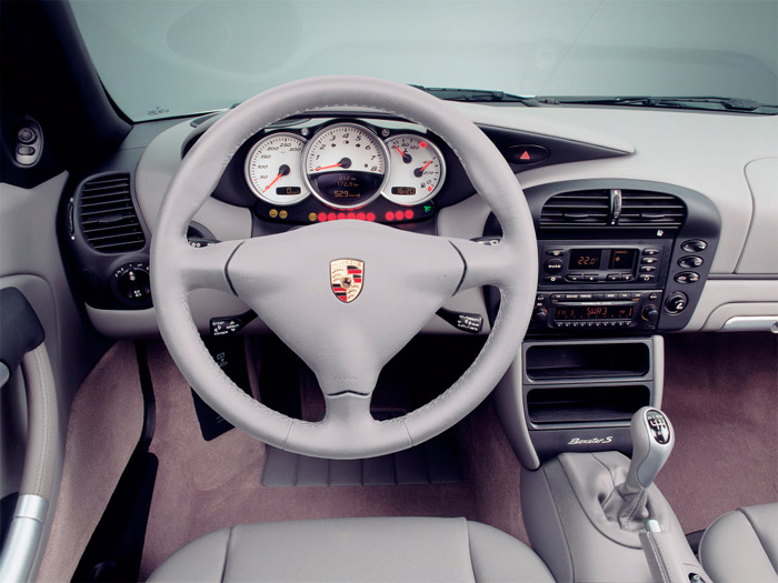 Дизайн передней панели автомобиля напоминает линии модели 911 (996). Качество отделки высокого уровня, а эргономика продумана до мелочей. Хотя кресла не обладают ярко выраженной боковой поддержкой, они идеально поддерживают тело и комфортны для вождения.
