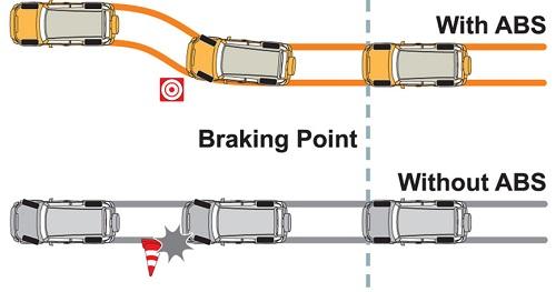 Для эффективного торможения водителю необходимо прерывистым нажатием на педаль тормоза имитировать работу системы ABS. Наибольший коэффициент сцепления протектора с дорогой, следовательно, и темп замедления автомобиля, достигается при 10-15% проскальзывании колес. К тому же при полной блокировке колес машина начинает скользить (идет юзом), что чревато возникновением заноса и увеличением тормозного пути.