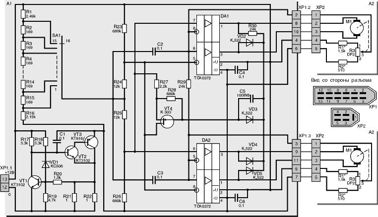 Электронный блок управления (ЭБУ) регулирует положение штока, подавая управляющее напряжение на сервопривод. Рассмотрим управление корректорами фар с электромеханическим приводом на примере устройства БУК 02-01, используемого в отечественных автомобилях. Ключевым элементом управляющей платы является мостовая схема на двухканальном операционном усилителе. Одно плечо подключено к датчику фактического положения штока, другое — к входному контакту платы управления. Влияние на электропривод корректора осуществляется изменением управляющего сигнала на входе платы. При ошибке рассогласования моста управляющая система подает напряжение на сервопривод, пока напряжение на выводах датчика положения не станет равным управляющему. В электронном блоке управления предусмотрена защита от перенапряжения в бортовой сети автомобиля. Когда переключатель электромеханического корректора фар остается в одном положении, электродвигатель отключен.