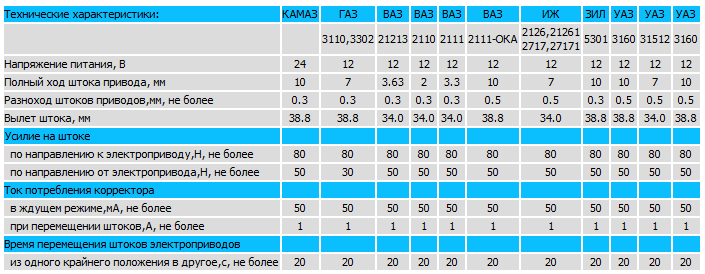 К примеру, мотор-редуктор корректора фар ВАЗ 2110 должна иметь вылет штока 34 мм, а ход – 2 мм (у ВАЗ 2111 вылет штока – 34 мм, ход – 3.63 мм), тогда как вылет штока оригинальной системы на основе БУК02-01 для автомобилей ГАЗ составляет 38,8 мм, а ход – 7 мм. Систему можно инсталлировать без переделок, но корректор будет работать только в нескольких положениях, а шаги регулировки будут слишком большими для правильной настройки света фар.