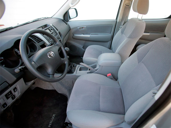 Интерьер Toyota Hilux может быть весьма разнообразным. Рассмотрим различные варианты обивки сидений. В стандартной комплектации используется винил. В более дорогих версиях используются более качественные материалы. Например, в версии SR5 установлен велюр на сиденьях. В топовых модификациях можно встретить кожаную обивку. Аналогично обстоит ситуация и с комплектацией. Базовые версии оснащены 2 подушками безопасности и ABS. В некоторых модификациях может быть установлено до 6 подушек безопасности. Также существуют варианты без дополнительных комфортных опций.