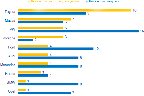 Лидером стал Opel Meriva, сместив с пьедестала прошлогоднего победителя Volkswagen Polo. Японские марки автомобилей чаще встречаются в старших возрастных группах. Например, Toyota представлена 9 моделями в топ-10 в разных возрастных категориях, в то время как Mazda – 6 моделями, встречающимися 7 раз.