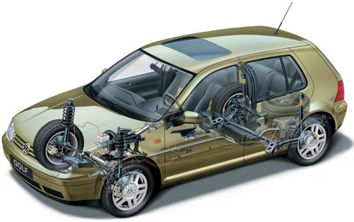 Ходовая часть у большинства моделей Volkswagen Golf 4 обладает простой, надежной конструкцией, доступной в обслуживании и достаточно комфортной для своего класса. Передняя подвеска выполнена по типу “Макферсон”, в то время как задняя имеет различные варианты. На моделях с передним приводом установлена более простая Н-образная балка, а на полноприводных моделях используется многорычажная подвеска, усложняющая и увеличивающая стоимость обслуживания.