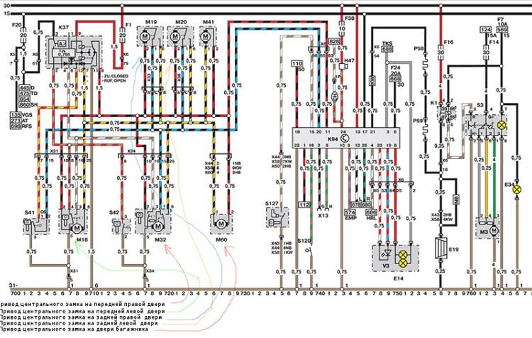 - M18, M19, M20, М32 – активаторы в дверях. М41 – замок запирания лючка бензобака, М60 – сервопривод багажника; Для работы сервоприводов достаточно 2 провода, которые называются силовыми. Разница потенциалов на этих проводах запускает двигатель, передвигающий тягу замка. В зависимости от того, на каком из проводов будет -, а на каком +, моторчик будет крутиться в одну либо другую сторону. Третий провод (сине-черный) необходим штатной сигнализации для контроля состояния замков.
