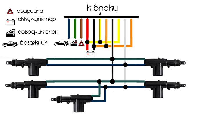 При нажатии кнопки на брелке имитируется поворот ключа в замке, что открывает и закрывает автомобиль. Блок управления принимает сигнал и подает напряжение на силовые провода. Для его работы и замков требуется всего шесть проводов: